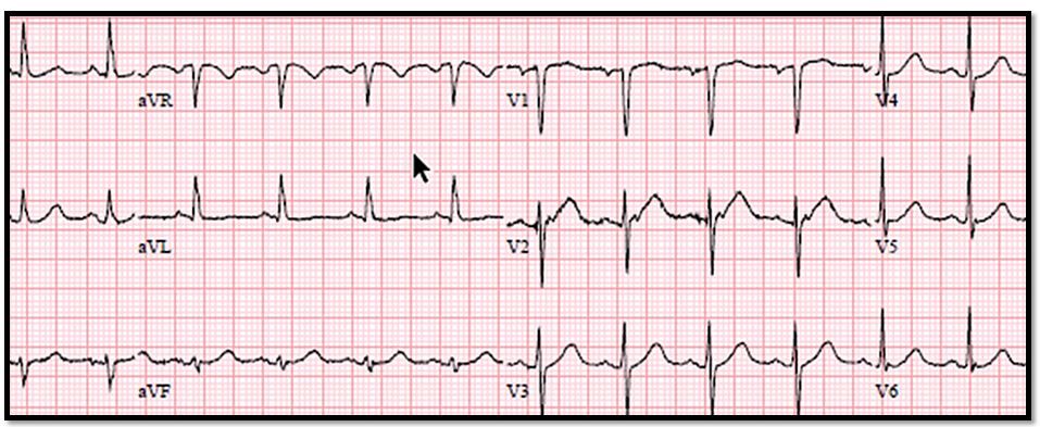 Answers1. What does the case ECG image show? Not much. There are flat T waves in aVL and the upslope of the T-waves in V2 and V3 are a bit straighter than normal. These are nonspecific findings