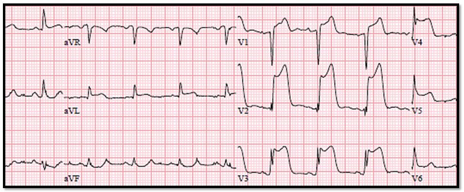 Case conclusion: Tracing from the patient's repeat ECG is shown in Figure 2, above. The patient was taken to the cath lab, where he had angioplasty and stenting of a completely occluded LAD.