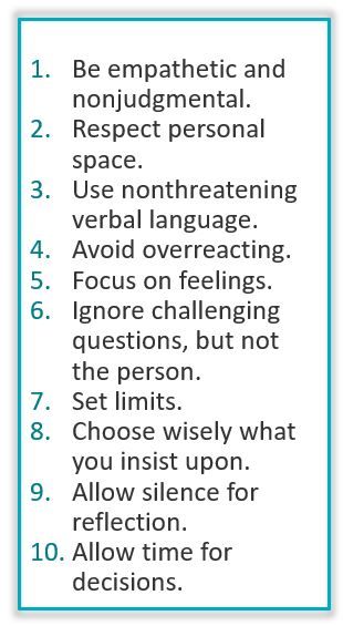Allow silence for reflection. Silence is an important tool in allowing the person the mental space to reflect on (or process) what is happening and how he or she needs to proceed.