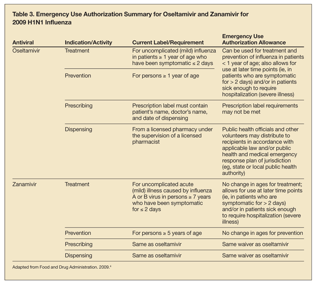 The FDA issued emergency use authorization (EUA) for oseltamivir, zanamivir, and the investigational drug peramivir.3,4 This EUA remains in effect as long as the federal government’s designation of a health care emergency continues.3