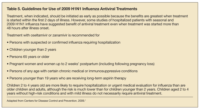 Antiviral medications can reduce the severity and duration of influenza as well as reduce complications and the risk of death. The CDC guidelines currently recommend prompt, timely antiviral use in children and adults who are severely ill, hospitalized, or at high risk for the development of complications (Table 5).1