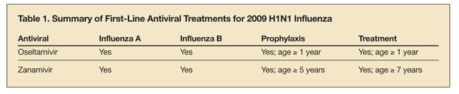 The FDA has approved 2 classes of influenza drugs: adamantanes and neuraminidase inhibitors. The ada-mantane class has been available since 1976, when amantadine was approved for the prevention and treatment of influenza A and B virus infections. Because 2009 H1N1 influenza virus is resistant to adamantanes, only the neuraminidase inhibitors, oseltamivir and zanamivir, are currently recommended as first-line treatments (Table 1).1,2