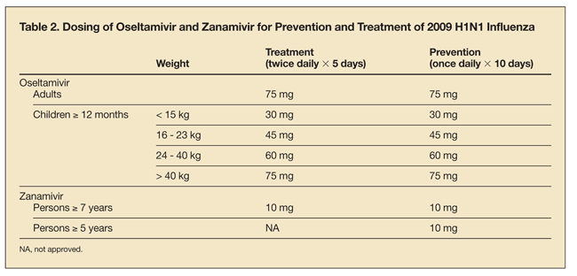 A summary of the current dosing recommendations for the neuraminidase inhibitors in adults and children is shown in Table 2. A discussion of adverse events and contraindications is included in the guidelines from the CDC.1