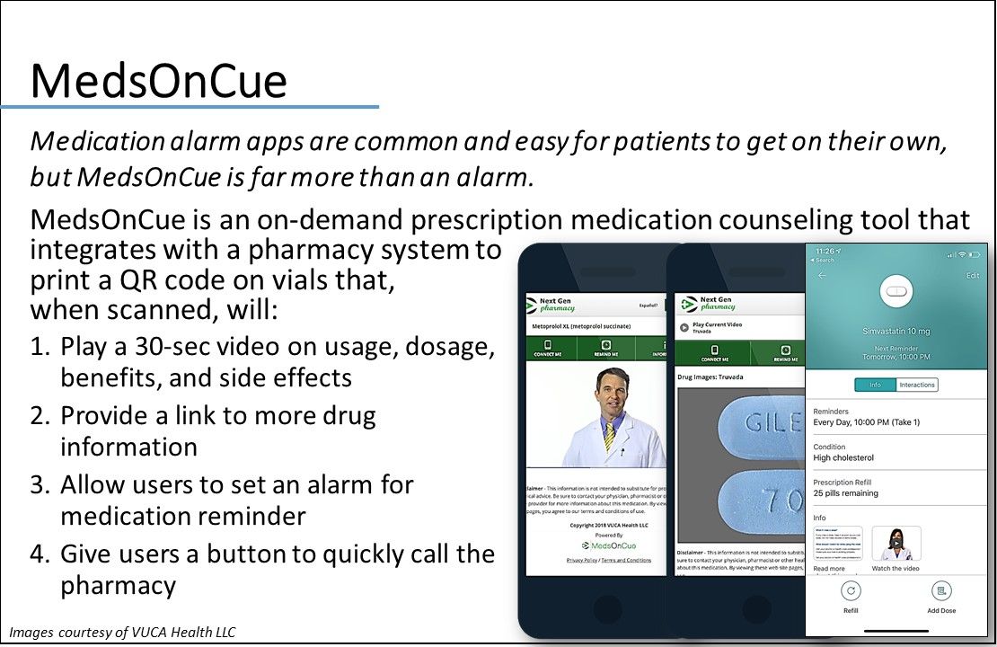 Patients will often discard the paper medication information leaflets that accompany a prescription medication. MedsOnCue has received approval in numerous states for pharmacies to opt-in patients to receive only the QR code in place of leaflets. There is also an inpatient version, where discharge medication counseling videos can be queued up on a tablet PC and the patient can listen to them prior to going home.