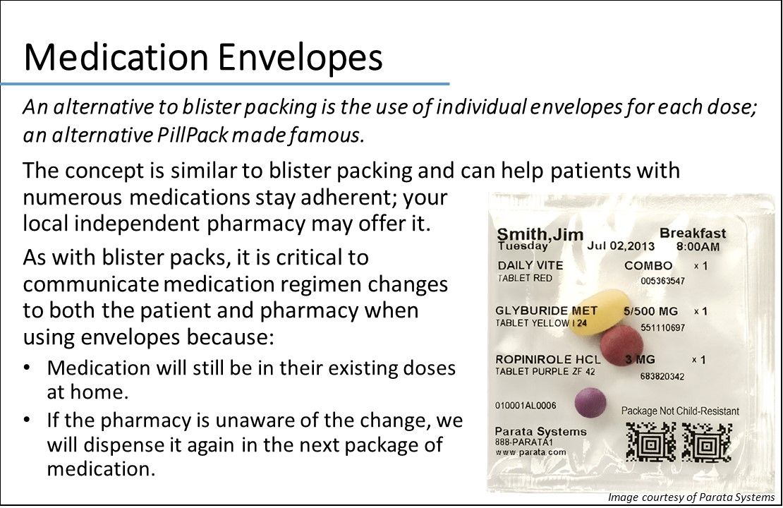 As with blister packs, it is critical to communicate medication regimen changes to both the patient and pharmacy when using envelopes because: