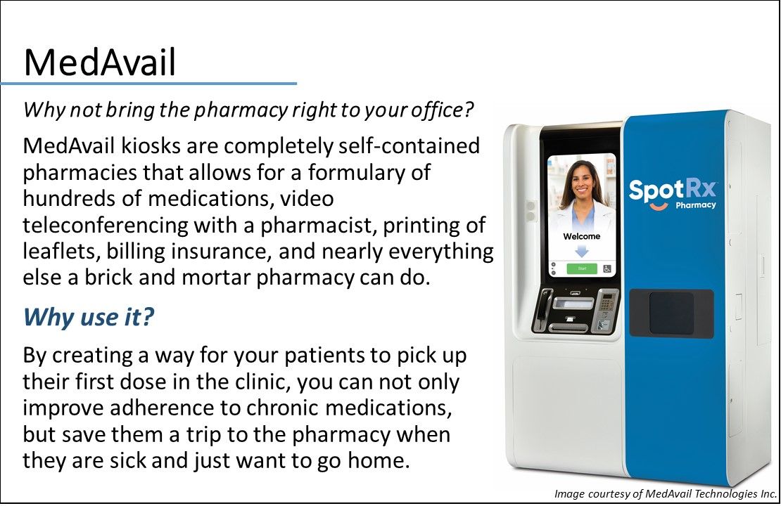 Why not bring the pharmacy right to your office? The MedAvail kiosk at the health system I work for holds up to 550 bottles of medications; we are putting ours in a cardiology clinic and it will contain nearly everything the office would write for. A pharmacist and/or pharmacy technician is operating the kiosk at all times, so pharmacists can still bill insurance, counsel patients, check for drug interactions, and everything else we would otherwise do.
