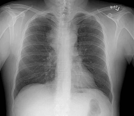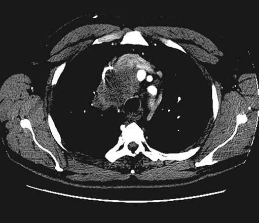 The patient's chest radiograph (Figure 1) and CT scan of the chest after administration of intravenous contrast material (Figure 2) are shown below.