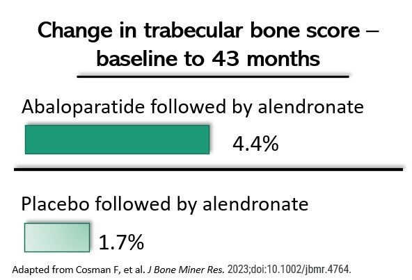 Reference: Cosman F, Hans D, Shevroja E, Wang Y, Mitlak B. Effect of abaloparatide on bone microarchitecture assessed by trabecular bone score in women with osteoporosis: post hoc analysis of ACTIVE and ACTIVExtend. J Bone Miner Res. Published online January 1, 2023. doi:10.1002/jbmr.4764