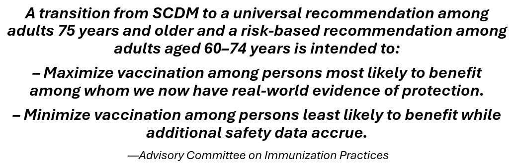The original recommendation made ahead of last year’s RSV season, the first for which any vaccine against the infection was available, was for immunization of adults aged 60 years and older based on a “shared clinical decision making” (SCDM) model that encouraged a conversation between patient and clinician on the risks and benefits of the vaccination.1