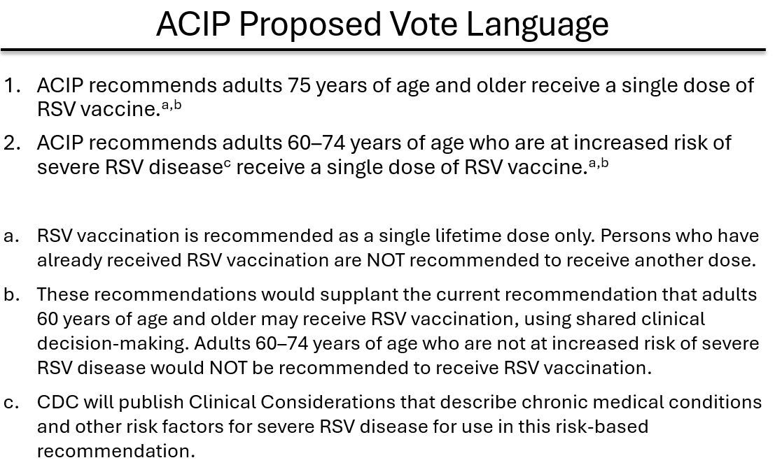 The committee endorsed a universal recommendation for a single lifetime dose of RSV vaccine for adults aged ≥75 years and a risk-based recommendation for those aged 60 to 74 years.