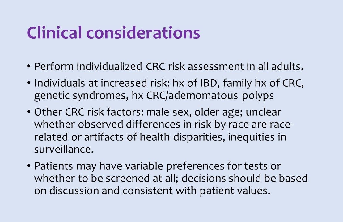 The guidance targets adults at average risk for CRC and does not apply to anyone with a family or personal history of CRC, with a long-standing history of inflammatory bowel disease, with genetic syndromes such as familial cancerous polyps, or a personal history of benign polyps, or other risk factors.