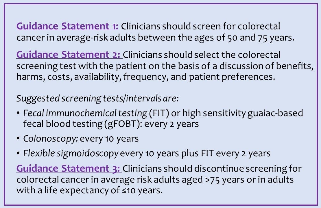 Research demonstrates that the median age for a diagnosis of colorectal cancer is 67 years and that persons aged 65 to 75 years derive the greatest benefit from CRC screening. The ACP, in its review, found that screening in adults aged 50 to 75 years also is beneficial. The new Guidance Statement 3 recommends that physicians should stop screening for CRC in average risk adults older than age 75 years or with a life expectance of fewer than 10 years. The 3 ACP Guidance Statements in full are below.