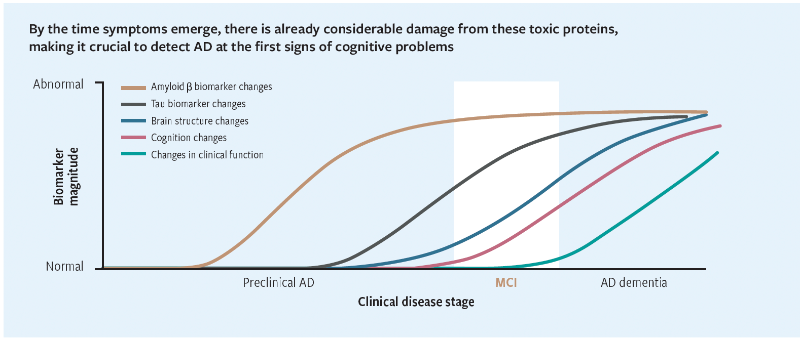 Research results show that amyloid β and tau start accumulating years to decades before clinical symptoms emerge. 7-10 AD exists on a continuum of 5 stages: preclinical AD, mild cognitive impairment (MCI) due to AD, mild AD dementia, moderate AD dementia, and severe AD dementia, at which point physical health is affected, verbal communication is diminished, and care partner assistance becomes necessary. 1,11,12 Patients in the preclinical stage are asymptomatic; however, during this time, there is evidence of AD pathology including the rise of amyloid β and tau. By the time mild cognitive symptoms appear in the stage of MCI due to AD, there is already considerable damage due to toxic proteins (Figure 2). 1,11,13