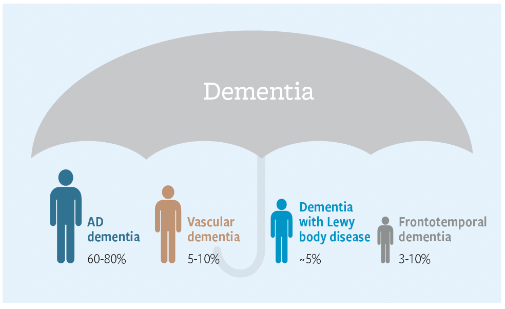 The term dementia encompasses a group of symptoms that include difficulties with memory, language, problem-solving, and other thinking skills. Other less common types of dementia include but are limited to vascular dementia, dementia with Lewy bodies and frontotemporal dementia.2 A full clinical work-up is necessary to differentiate AD from other forms of dementia and to form a definitive diagnosis, as biological changes associated with various dementias can be similar.3,4