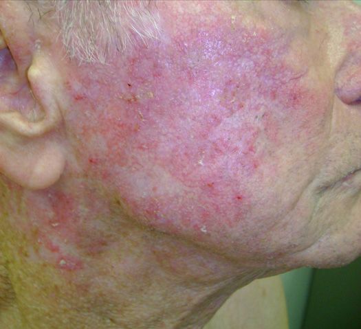 Key point: Without being overwhelmed by the expanse of pathology, the macular, scaly erythema covering his cheek and extending down to the neck, below the ear, is quite characteristic for actinic keratoses. An exceptionally large superficial basal cell carcinoma or unusually extensive squamous cell carcinoma in situ (Bowen disease) could also be considered. Several small biopsies done from various portions of the cheek and neck disclosed only actinic keratoses.