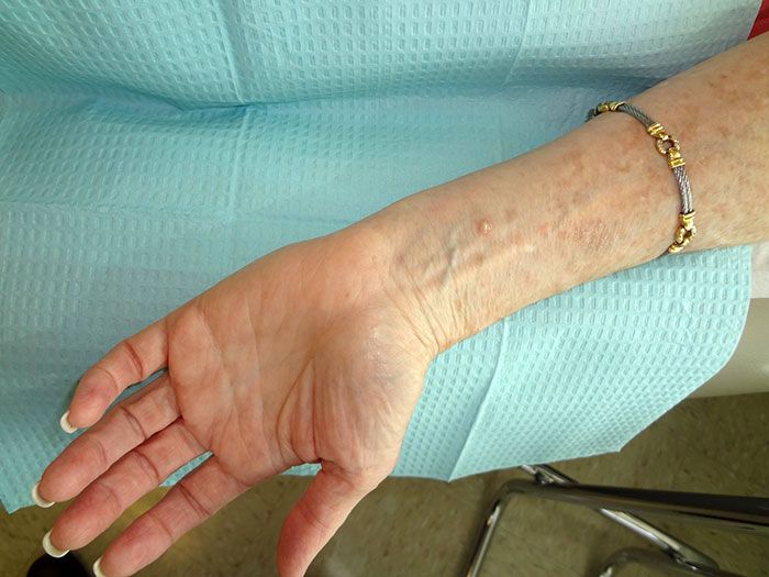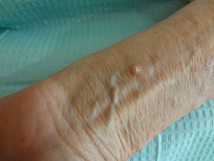 A 60-year-old woman with a past history of many non-melanoma skin cancers presented for a total body skin check. A tender nodule was discovered on the left wrist.