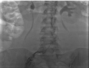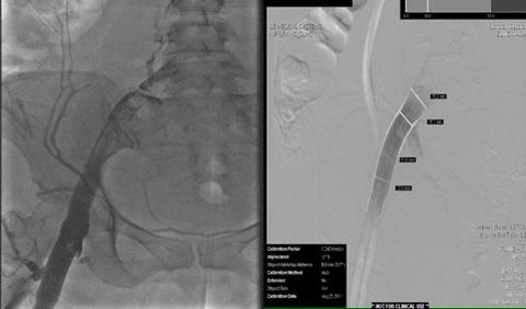 Residual thrombus (Figure 1) was noted in the origin of the left common iliac vein shortly after the procedure and required extensive catheter-directed infusion of tissue plasminogen activator. The following day additional mechanical thrombolysis was performed and the patient underwent post-procedure evaluation with intravascular ultrasound. A persistent round filling defect was noted at the inferior vena cava bifurcation with near complete occlusion of the right common iliac vein. There was progressive recurrence of thrombus in the left iliac venous system (Figure 2) and involvement of the right lower extremity, where a new clot was noted.