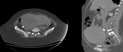 A 40-year-old obese woman with history of hypertension and uterine fibroids presented with acute onset of left lower extremity swelling and pain that began a day earlier. The pain mostly involved the left thigh and calf area. There was no tingling, numbness, or weakness of lower extremities. The patient denied recent surgery or trauma to the leg. She denied shortness of breath, palpitations, and chest pain. She did report progressive abdominal swelling over the past year. She had a history of menorrhagia for which she was taking norethindrone/ethinyl estradiol. She reported no family history of cancer, hypercoagulable state, or cardiovascular disease. She denied any history of cigarette smoking.