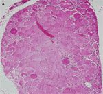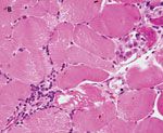 The patient was admitted with a diagnosis of acute rhabdomyolysis secondary to alcohol and cocaine use. He received vigorous intravenous hydration initially with normal saline and subsequently with bicarbonate-containing fluid. Despite these measures, CK values remained elevated at 8000 to 10,000 U/L, and there was little clinical improvement after a week. A surgical muscle biopsy revealed an inflammatory myopathy with eosinophilic degeneration, consistent with atrophy (A). There were focal areas of necrosis and a perifascicular distribution of mononuclear cells, including lymphocytes and rare polymorphonuclear cells (B). These findings were diagnostic of dermatomyositis.