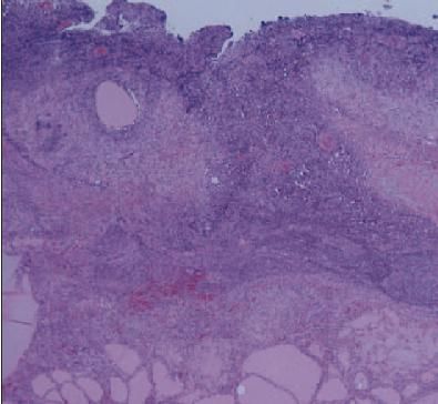 A microscopic photograph of the thyroid gland specimen after right subtotal thyroidectomy demonstrates chronic active inflammation with abscess formation (hematoxylin-eosin stain, original magnification 40).