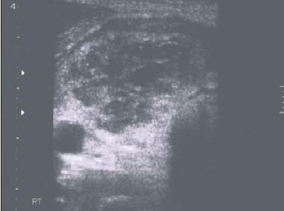 A sonogram at the time of aspiration indicates diffuse heterogeneous echogenecity in the lower right pole of the thyroid gland, including a multiseptated cystic portion.