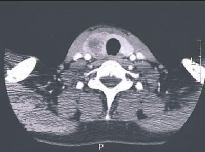 This neck CT scan shows a cystic lesion of the thyroid gland with decreased enhancement.