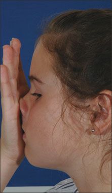 Girl in no distress. Vital signs unremarkable. Eyes not swollen or red at this moment. Nose breathing. No wheezes on auscultation. Habitus normal. Serious expression lightens appropriately with conversation. Developmentally normal for age. No dry skin found in elbow or knee flexures.