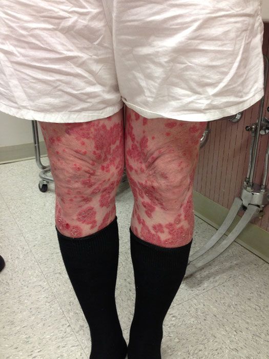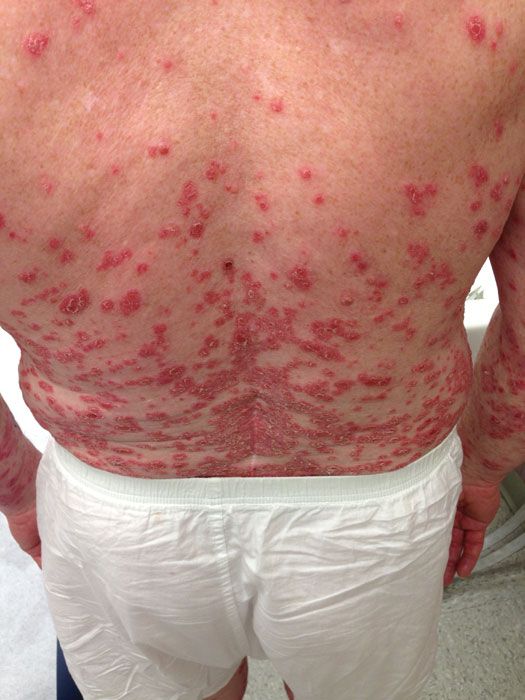 Key point: Physical examination revealed a disseminated rash consisting of indurated, erythematous plaques variably covered by silver scales. A biopsy was read as psoriasis.