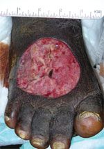 This painful, purulent, malodorous, 5 x 5-cm ulcer developed a few days after the 71-year-old patient had struck his foot against a radiator. For the past 24 hours, he had subjective fevers and chills. He denied recent travel and saltwater or freshwater exposure. He had chronic lymphedema and admitted to drinking alcohol socially.