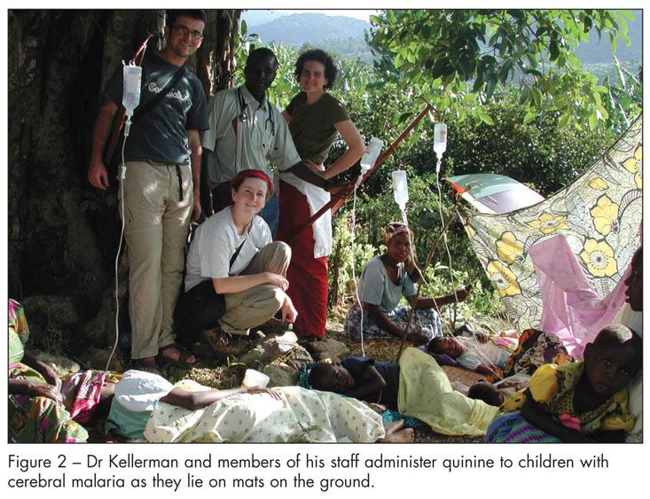 Forest and learning the Batwa’s language, culture, and traditions. We conducted mobile medical clinics under the protection of spreading fig trees, seeing 300 to 500 patients daily. We hung intravenous solutions from tree branches, secured them with vines, and dripped quinine into the veins of children who had cerebral malaria (Figure 2). Surgery was performed on mats laid on the open ground; this always drew a crowd.
