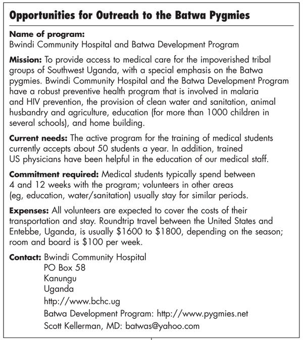 During our 6-week visit, we unearthed appalling statistics; for example, the childhood mortality rate of the Batwa pygmies was 38%, twice as high as the Ugandan average (itself one of the worst in the world). The pygmies were dying of malaria, dysentery, malnutrition, and the usual complement of tropical diseases. Without intervention it was obvious that they would not survive for long.