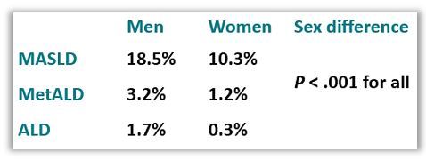 Further, when the researchers assessed SLD phenotypes in “putative order of etiologic severity (ie, metabolic dysfunction-associated steatotic liver disease [MASLD], MetALD, ALD),” they found trends across the deteriorating phenotypes were not significant for sex differences in prevalence of the conditions but were significant for both sexes in the risk for mortality.1