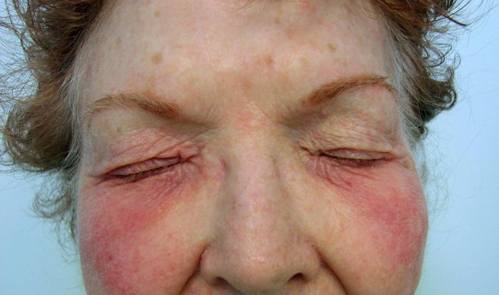 A 70-year-old woman was seen on an emergency basis because of the acute onset of an intensely pruritic eruption on the face. She had a history of eczema.