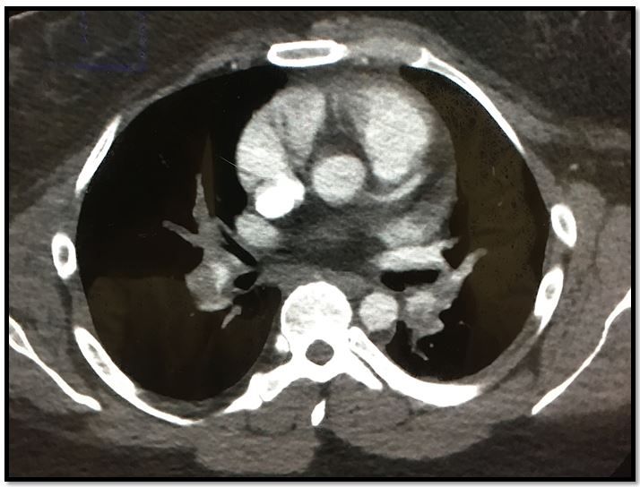 What should you do next? Order a CT chest to evaluate for PE. It was positive for multiple large PEs (see Figure 2, at right; please click to enlarge).