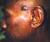 A 58-year-old man sought evaluation of an enlarging, painful ulceration onthe left temple that first arose 2 weeks earlier as a small papule. Recently, the patienthad been healthy; however, his history included unstable angina, a primaryseizure disorder, and narrow-angle glaucoma. His medications were diltiazem,phenytoin, aspirin, and pilocarpine. The patient smoked marijuana occasionally;he denied injection drug use.