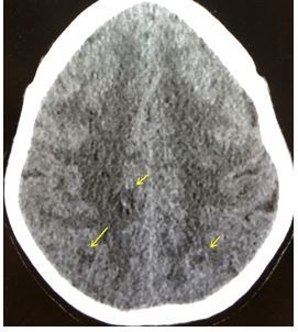 Imaging: A CT scan is done of the head. The cut shown below includes yellow arrows highlighting abnormalities.