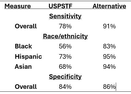 Specifically, the alternative criteria had 91% sensitivity vs USPSTF sensitivity of 78%, and specificity of 86% vs 84%, respectively, (both P <.001). For racial and ethnic minority groups, the alternative screening criteria provided more significant gains in sensitivity vs the USPSTF criteria at similar specificity (Table, below left).
