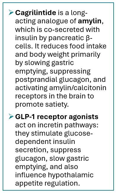 Cagrilintide is a once-weekly injectable analogue of amylin, a hormone co-secreted with insulin that regulates satiety and slows gastric emptying. Unlike currently approved GLP-1–based weight loss therapies, cagrilintide targets a distinct pathway, offering a potential complementary mechanism for obesity management (Figure).