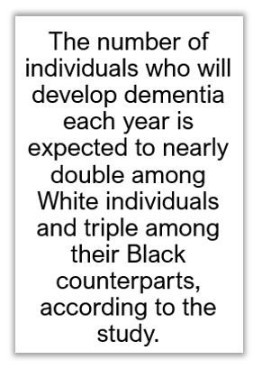 The number of individuals who will develop dementia each year is expected to nearly double among White individuals and triple among their Black counterparts, according to the study.1