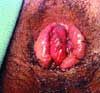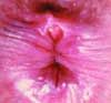 The majority of fissures appear as anodermal defects located in the posterior midline, although 10% of women and 1% of men have anterior fissures. An associated "sentinel pile" or sentinel skin tag can often be seen at the distal or caudal extent of the fissure (see Figure 6); this represents fibrosis and excess granulation from the ulceration. These skin tags are frequently mistaken for hemorrhoids; however, a midline location-especially of an isolated skin tag-helps rule out symptomatic hemorrhoids. Fissures that are unusual in appearance or location may be associated with Crohn disease, malignancy, tuberculosis, syphilis, Cytomegalovirus infection, or HIV infection.