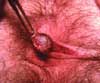 However, if the pain is severe or an ulceration has developed (as a result of ischemia of the overlying skin [see Figure 1]), surgical excision can relieve symptoms. Locally anesthetize the hemorrhoid, make an elliptical incision, and evacuate the clot or, preferably, excise the hemorrhoid (Figure 2). The remaining wound can be left open or closed loosely with 4-0 chromic gut suture.