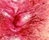 Patients with internal hemorrhoids present differently than do patients with symptomatic external hemorrhoids. Symptoms may include bleeding, protrusion, fecal soiling, and itching. Because the columnar mucosa involved in internal hemorrhoids lacks nerve endings, pain is typically not present. If a patient with enlarged internal hemorrhoids complains of pain, look for another source. Internal hemorrhoids often coexist with external hemorrhoids (Figure 3).