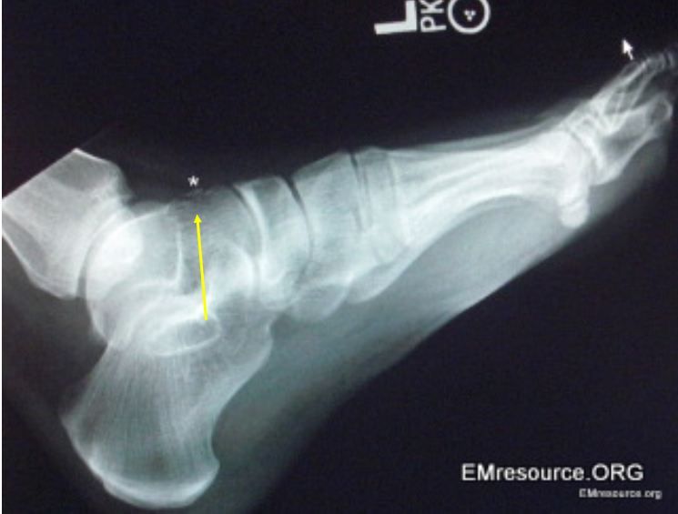 There is a subtle fracture on the superior part of the anterior talus. See Figure, above, and note area at point of arrow.Please click image to enlarge. Discussion