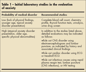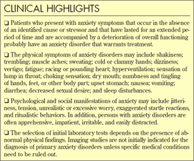 The selection of initial laboratory tests depends on the presence of abnormal physical findings.8 Guidelines for ordering tests and studies are outlined in Table 1. Imaging studies are not initially indicated in the diagnosis of primary anxiety disorders unless specific medical conditions need to be ruled out. If intracranial pathology is suspected, a head CT scan or MRI scan may be required.