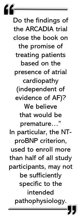 They believe the ARCADIA findings essentially set the stage for additional research and emphasize that future studies “to identify optimal therapeutic strategies for patients with atrial cardiopathy should focus on markers as directly reflective of left atrial pathology as possible.”2