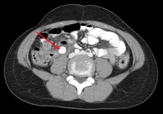 In a patient with a history of acute appendicitis and appendectomy, presence of an appendicolith in the abdominal cavity suggests either retention after initial appendectomy or impaction and subsequent inflammation of the appendiceal stump. Some 30% of cases of acute appendicitis in children are associated with appendicolith.1 When perforation occurs, the appendicolith can be released into the abdominal cavity and missed during surgery, thus becoming a nidus for infection, even years down the road.1 Likewise, residual tissue left at the appendiceal stump can become impacted by a new fecalith, causing inflammation and infection that present with symptoms identical to those of acute appendicitis. This condition is known as stump appendicitis.