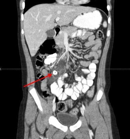 CT scan of the abdomen with contrast showed a 1.1-cm calcified density in the right lower quadrant and an adjacent 1.8 x 1.8-cm fluid collection (Figures 1, 2). The patient underwent exploratory laparotomy the next day and was found to have an appendicolith embedded below the mesentery of the terminal ileum with adjacent abscess; no appendiceal stump was present. A diagnosis of retained appendicolith with abscess formation was made, and the abscess and nidus were removed. The patient rapidly improved without complication and was discharged 1 week following surgery.