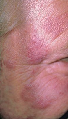 A 56-year-old man has had progressive, erythematous plaques across the forehead and temples for the past few weeks. He describes these areas as “a little itchy and a little tender.”