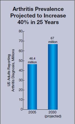 An estimated 46.4 million US adults, or approximately 21% of the adult population, self-reported a physician-diagnosed form of arthritis, which is the leading cause of disability in the United States, according to 2005 data collected by the National Arthritis Data Work group. The work group estimates that by 2030, the number of US adults aged 18 years and older with arthritis or other rheumatic conditions will jump to nearly 67 million (25% of the adult population)-an increase of about 40% (Figure 1).