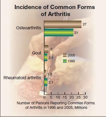 About 27 million US adults have osteoarthritis, one of the most common forms of arthritis, an increase from the 1995 estimate of 21 million adults (Figure 2). Rheumatoid arthritis affects 1.3 million US adults, a decline from the estimated 2.1 million adults in 1995 resulting from a combination of more restrictive classification criteria and a drop in prevalence. Approximately 3 million US adults had self-reported gout in 2005, an increase from the 1995 estimate of 2.1 million adults with the condition.